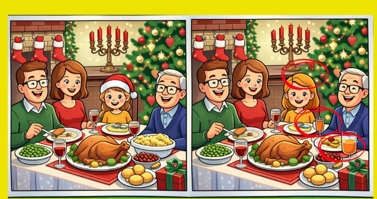 Tak co, jste připraveni na další výzvu? Podívejte se pozorně na dva obrázky vánoční rodinné večeře. Na první pohled mohou vypadat stejně, ale skrývají se v nich 3 malé rozdíly. Myslíte, že je všechny najdete za 16 sekund? Zkuste to a otestujte svou ostrost zraku!