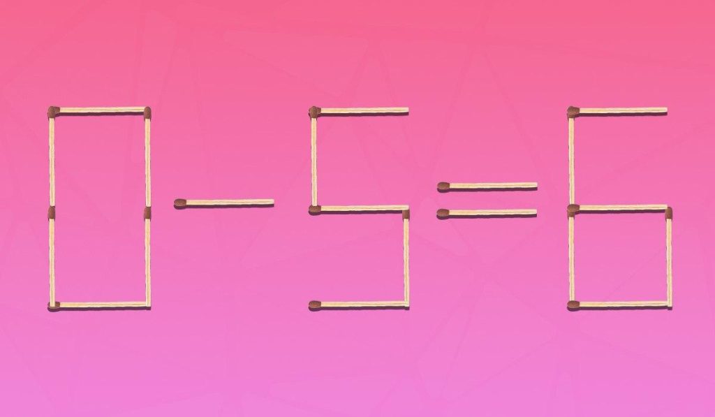 Úkolem hádanky je opravit matematicky nesprávnou rovnost. Níže uvidíte obrázek, kde je 0-5=6 seřazeno pomocí sirek. Je zřejmé, že je zde něco špatně.