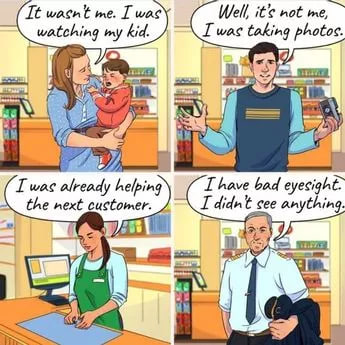 Stačí se podívat na obrázek níže a určit, která z osob v obchodě někomu ukradla peněženku. Tři z lidí na obrázku mluví pravdu, ale jeden z nich lže.