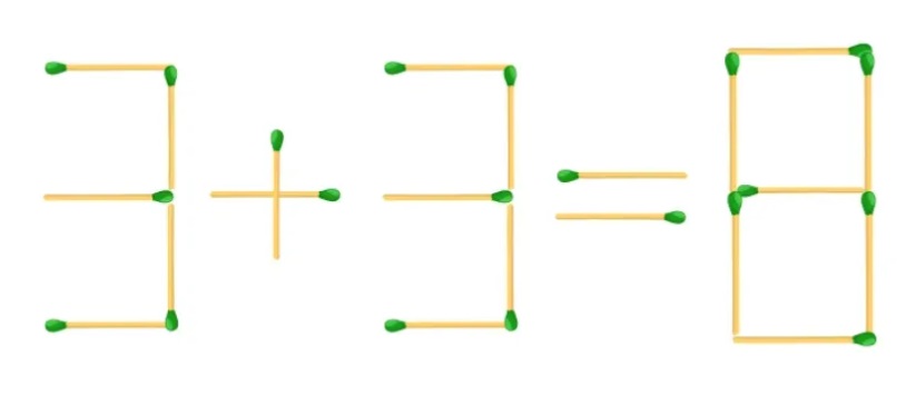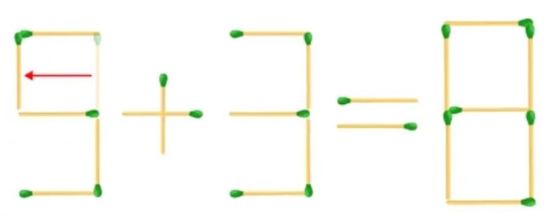 Tajemství spočívá ve změně tvaru čísel: stačí posunout jednu zápalku tak, aby se jedna z „trojek“ změnila na „pětku“. Poté se příklad stane naprosto správným – 5+3=8.